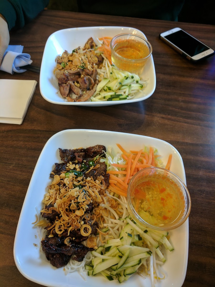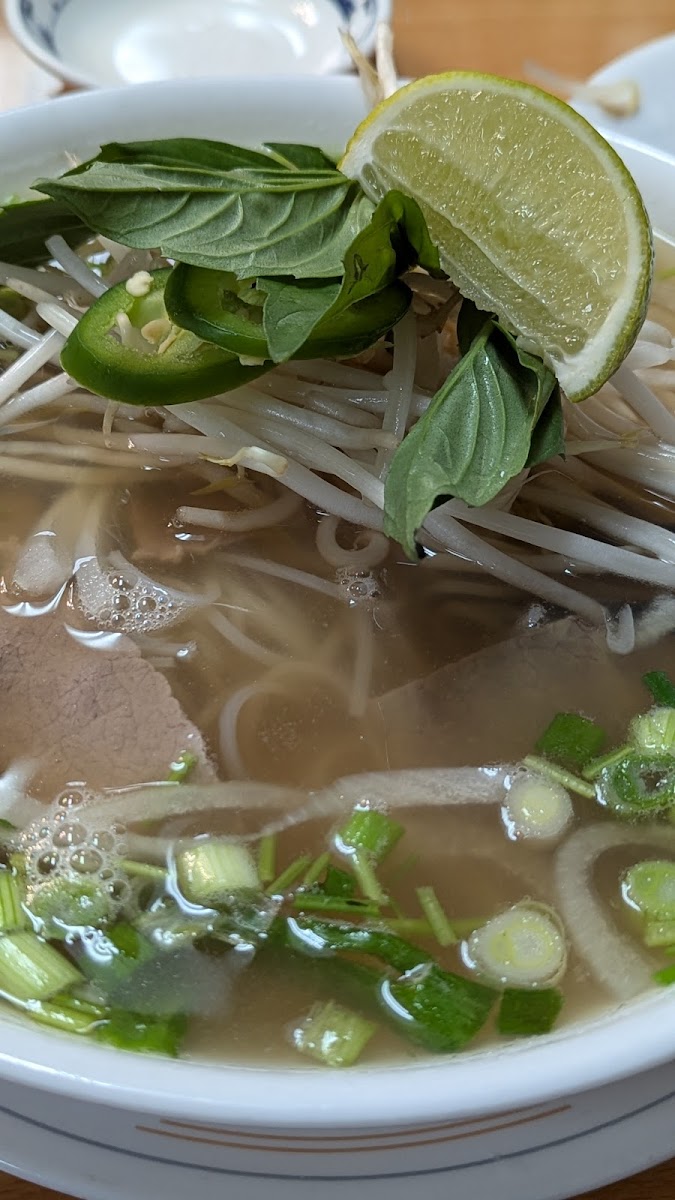 I always get the beef round pho with the soft tendon and it’s always great the atmosphere is peaceful and quiet i would highly recommend it. Tried the shrimp skewers that were charred perfectly. The servers are timid but very attentive. I wish I could post photos of the food but I already finished it all!